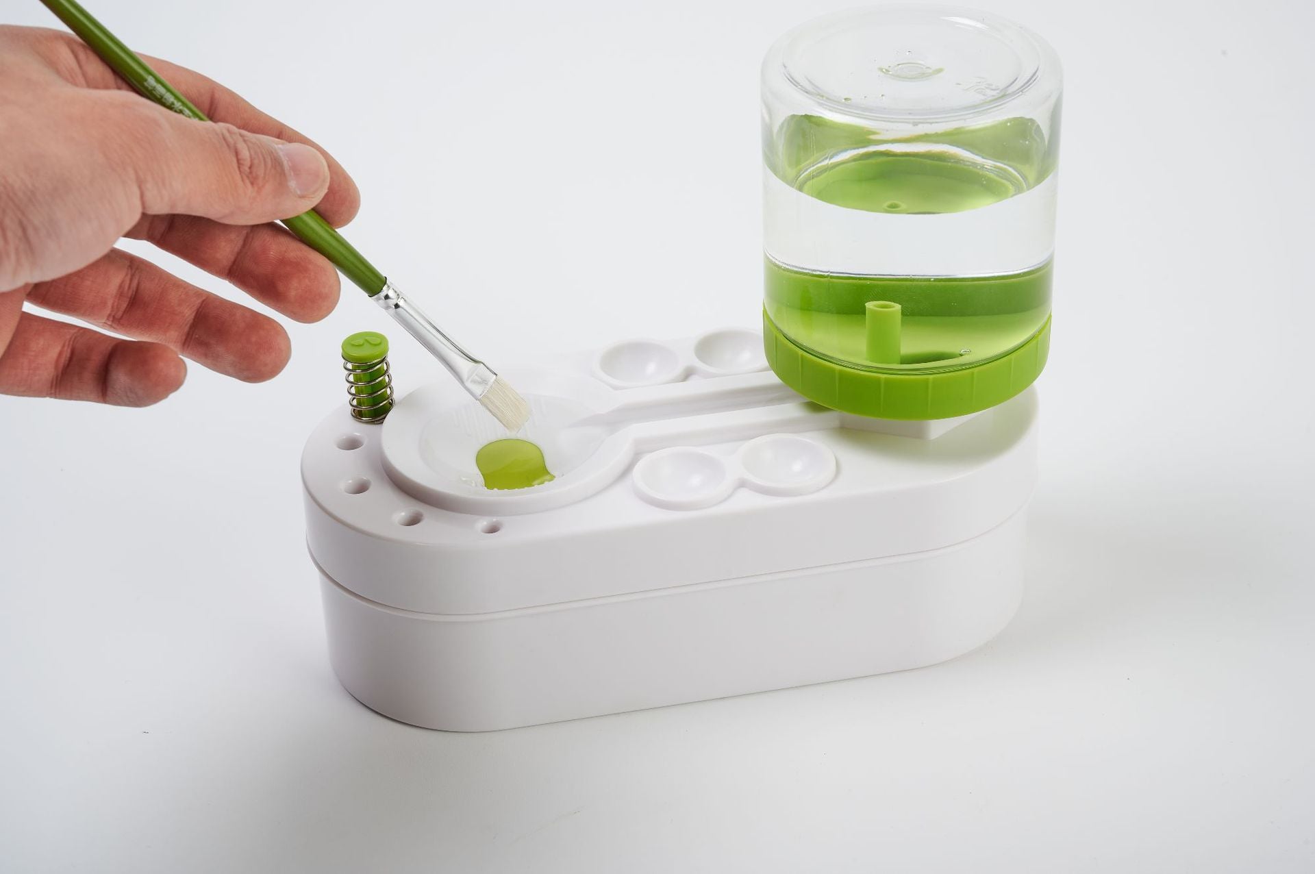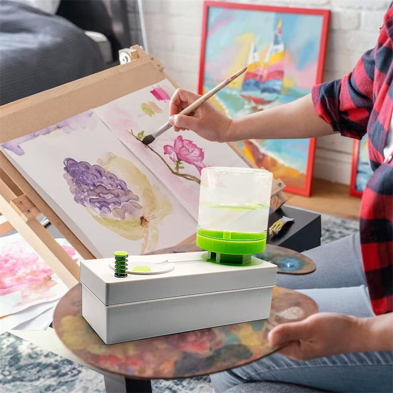 A hassle-free solution for makeup or brush-painting, with a push-button design that drains dirty water while replenishing with clean water, compatible with various paints and featuring easy maintenance for up to 30 uses.